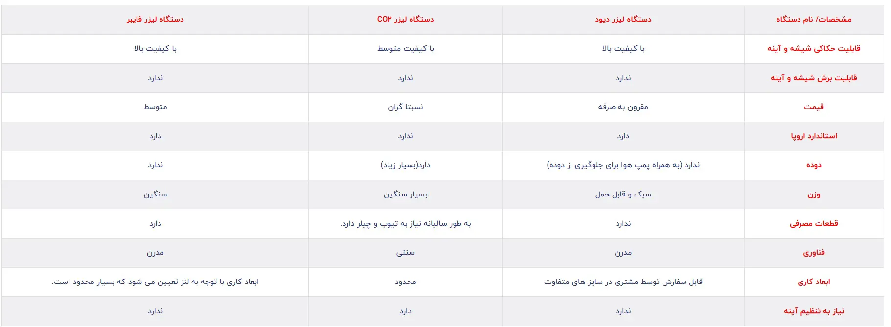 اگر میخواهید بدانید کدام دستگاه لیزر مناسب شماست به جدول زیر و تفاوت های دستگاهای لیزر توجه کنید