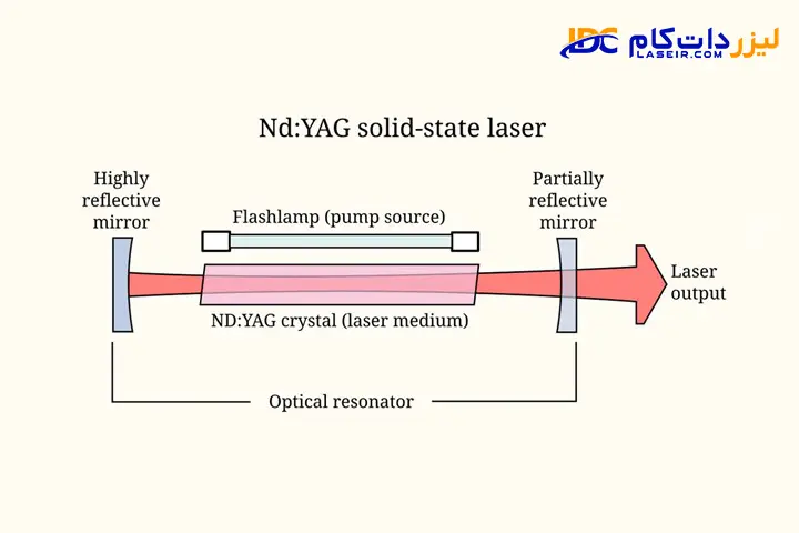 کلمه لیزر مخفف عبارت: “Light Amplification by Stimulated Emission of Radiation (LASER)” به معنی تقویت نور توسط تابش های القایی است. لیزر منبع نوری بسیار پرقدرت و متمرکز است که می تواند تا فواصل چندین کیلومتری منتشر گردد و خصوصیات خود را حفظ کند. سورس لیزر از 3 بخش اصلی تشکیل شده است که در شکل زیر نمایش داده شده است. این سه بخش فرایدنهای زیر را انجام می دهند.