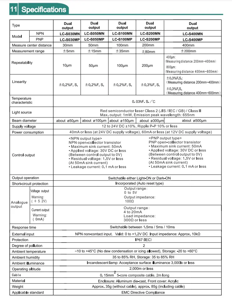 به طور کلی جدول مشخصات فنی سنسورهای لیزری به شرح زیر است: